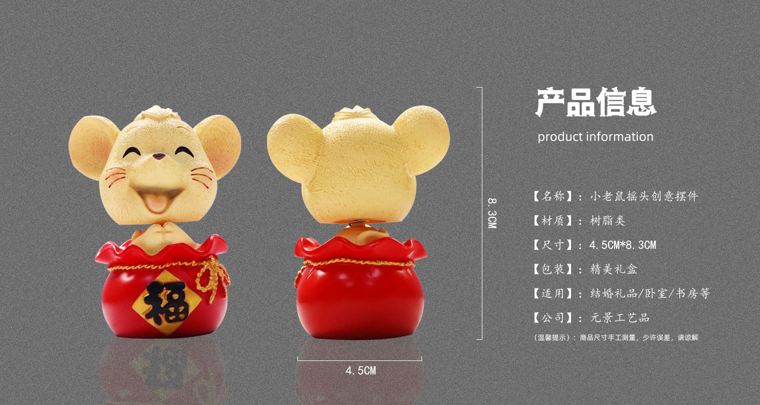 • 小老鼠搖頭公仔擺件采用樹脂工藝制作而成,此款擺件適合家居送禮/有車一族/年輕化群體等,擺件豐富多樣,支持批量定制,免費(fèi)設(shè)計(jì)等服務(wù),價(jià)格優(yōu)惠,做工精美,定制周期短,發(fā)貨速度快...